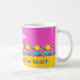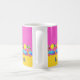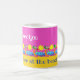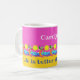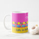 This mug has the slogan: Life is better at the beach. It can be personalized with your name. It's decorated with a frieze celebrating beach life, with sunshine, palm trees, blue sea and golden sand. The design is complemented by bright pink and sunshine yellow colour blocks. The artwork is an original, unique, hand drawn stylised drawing, digitally coloured.