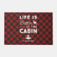 This rustic family cabin doormat will welcome family and friends to your cabin. The design features the phrase "Life is Better at the Cabin" with accents of an arrow, deer and forest pine trees. The background in a red and black buffalo check plaid framed by rustic wood. Personalize with your family name and year established.