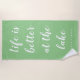 Life is better at the lake personalized green Beach Towel. Cool hand lettered brush script typography print for humourous quote. Unique gift ideas for him or her. Light blue or custom background colour. Large size for beach or pool. Create your own extra large towels for best friends, retiree, retired person, pensioner, family, husband, wife, co worker, colleague, fun boss, employee, mom, dad, sister, brother, aunt, uncle, grandpa, grandma, manager, teacher, nurse, coach, teammate, office worker, swimmer, traveller, couple etc. Big letter text template. Elegant hand lettering calligraphy with pretty swirly letters. Personalize with his or her name at the bottom.