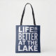 Our lakeside-chic tote bag features "Life is Better at the Lake" in modern white block typography on a rich navy blue background.