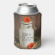 A can cooler which says: Life is better in the country. Designed with a rustic theme. A photograph of a white milk jug and a couple of orange flowers placed around the milk can. Sitting in a barn on some hay. Wooden panels in the background. Perfect for the cottage.