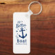 A stylish nautical themed 2 sided keychain with brush script and regal typography reading "Life is Better on the Boat" along with your family name, boat name or other desired text. This design features a classic boat anchor and five stars. Colours are classic navy blue on white or easily customize the base colour to your liking. Makes a great gift for any occasion.