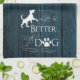 The perfect kitchen towel for those who find life much better with a dog in it. The Life is better with a Dog Kitchen Towel features text that says "Life is better with a Dog." with a paw print and dog silhouette embellishment against a deep blue rustic wooden background. Additional gift items available with this design as well.