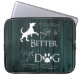 Protect your laptop when you're on the go with a Life is better with a Dog Laptop Sleeve. Laptop Sleeve design features a deep teal rustic wooden background with the saying "Life is better with a Dog" with a paw print and canine silhouette embellishments. Additional gift items available with this design as well.