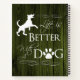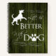 A perfect notebook for those who life much better with a dog in it. This notebook design features text that says "Life is better with a Dog." with a paw print and dog silhouette embellishment against a deep green rustic wooden background. Additional gift items available with this design as well.