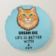 Brighten your home and your mood with our "Dream Big" ginger cat round throw pillow. Featuring a stunning illustration of a vibrant orange cat against a serene sky-blue background, this pillow carries the perfect reminder: "Life is better with a cat." Crafted from premium brushed polyester, it offers a soft-to-the-touch feel that's perfect for lounging. Whether you're a proud cat parent or looking for the ultimate gift for a feline lover, this 5-star rated cushion adds a splash of color and a lot of heart to any space.