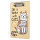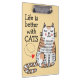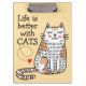Cute funny doodle of a cat sitting up with her eyes closed, pink cheeks and tan patches. To her left are the words life is better with cats in a fun black font. A small red love heart is buzzing its way down from the the letter C and the background is a beige colour.
