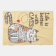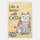 Cute funny doodle of a cat sitting up with her eyes closed, pink cheeks and tan patches. To her left are the words life is better with cats in a fun black font. A small red love heart is buzzing its way down from the the letter C and the background is a beige colour.
