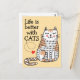 Cute funny doodle of a cat sitting up with her eyes closed, pink cheeks and tan patches. To her left are the words life is better with cats in a fun black font. A small red love heart is buzzing its way down from the the letter C and the background is a beige colour.