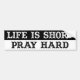 Attention-getting bumper sticker, black and white, says Life Is Short, Pray Hard.