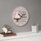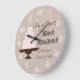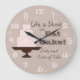 Slogan "life is short so eat cake, lots and lots of cake" with pink frosted tiered cake on stand with heart pattern background. Decorative wall clock.
