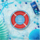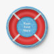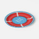 Red life preserver design on blue curley wave background to personalize for fun custom nautical themed party products.