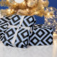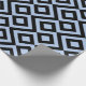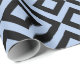 This bold light blue and black geometric pattern is an original ornamental design. Pale blue diamonds with black borders are surrounded by baby blue meanders which angle around them. Black zigzags separate the winding light blue paths and offset diamonds.