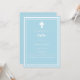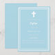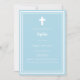 A light blue background, decorated with a white frame, and a white cross Personalize and add the name and details. White text.
