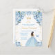 This elegant and glamourous birthday party invitation features a beautiful princess with brunette hair in a light blue ball gown. The text combines handwritten script and modern sans serif fonts for a classy and sophisticated look. The floral arrangements, butterfly and gold confetti create the perfect blend of rustic and chic.