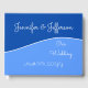 This modern, yet simple, wedding guestbook design features a light blue region, a dark blue region, and a white curve separating the two areas. It also features personalized names, a message, and a wedding date in a script like font.
