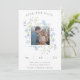 A pretty floral wedding save the date announcement perfect for your upcoming Spring wedding, featuring your favourite engagement shoot photo in a square frame of light blue watercolor wildflowers and green leaves. Personalize with your details in grey.