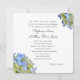 Light blue floral wedding invitations. Modern square cards with pretty blue hydrangeas in the corners and a white floral design on reverse. Black printed text with template at the top for parents of the bride, who are inviting guests. Also add parents of the groom with "son of" line. *Leave a space between printed lines of text to replicate this look.