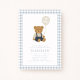 Featuring a sweet brown teddy holding a balloon and dressed in overalls, this adorable design sets the perfect tone for a cozy and heartfelt celebration. The soft blue gingham background adds a timeless, classic touch—perfect for baby showers or teddy bear-themed gatherings.