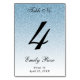 This trendy glitter table number card has faux glitter on the front and back along with the table number and personalization. Use the template form to add your information. The "Customize Further" feature can be used to change the font and the text layout.