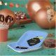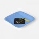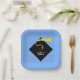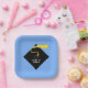 Creative graduation party or event plates for class of '25 grads featuring funny line and classic black graduation cap with gold tassel on light-blue background.