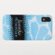 Bright teen style animal patterned case in black and blue hues. Personalize this item with your full name. This example currently reads: Jennifer Mcdonald. This original pattern by Sarah Trett, is based on the patterning found on a giraffe with a halftone moiré dot gain pattern overlay.