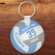 This sporty volleyball themed keychain features a realistic looking light blue, grey and white volleyball upon which you can customize the player's name & jersey number plus school or club name and mascot name in a varsity letter style font - by katz_d_zynes