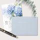 Chic and simple wedding envelope with a light blue jacket and elegant white font. Includes a subtle grey lined area in the front and return address at the back.