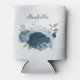Beautiful romantic can cooer featuring navy blue and light dusty blue flowers and some pretty leaves .