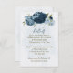 Beautiful romantic wedding reception details enclosure card featuring navy blue and light dusty blue flowers and some pretty leaves .