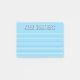 Lined post it notepad with your name at the top in big block letters white a white outline and black shadow. Lines in white and blue against a light sky blue background. Write down your notes and messages on this personalized blue sticky notepad with your name at the top.