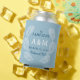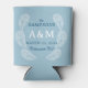 Perfect for a coastal wedding, engagement party or other event, this pale powder blue customized can cooler features easy to edit text in navy blue and white with text for a name, monogram letters, date and location surrounded by a wreath of illustrated, line art, white oyster shells to add a bit of coastal flair to showers, wedding receptions and more.