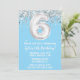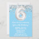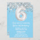 Light blue and silver 6th birthday party invitation age 6 birthday party invitation with glitter and modern script writing and fun foil balloons.