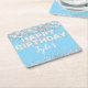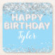 Light blue and silver birthday party coasters for a fun party with a modern classic look with glitter and foil balloons on paper coasters, tableware and barware.