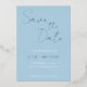 Simple, silver foil print wedding Save the Date card with white, stylized script on a trendy, light blue colour background. Edit names, date and location with your own wedding information. Change foil colour if desired. Background colour may be changed as well to match your wedding colour scheme.