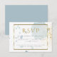 Wedding RSVP Response Card | Modern and rustic , light denim blue and gold paint splatters . A gold frame that is translucent enough to see the watercolor behind it encases the rsvp details written in a contemporary font. Meal Choice. Design created for the BarefootBride™ by © WhimsicalArtwork™ Customize text, font style, colour and size. We created this template is to make it easy for you to personalize with your own information. This is part of a complete Wedding Stationery Suite with matching wedding, baby shower and other event stationery.