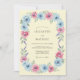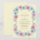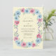 This design features a soft watercolor palette of light blue and pink roses arranged beautifully on a creamy yellow backdrop. Delicate sprigs of purple lavender and sage green foliage add a touch of nature-inspired elegance. The painterly style creates a romantic and airy atmosphere perfect for a seasonal springtime marriage event.