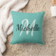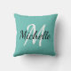 Throw pillow with a light teal blue background and white custom monogram first initial and first name.
