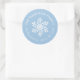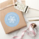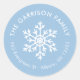 Affordable custom printed round return address stickers personalized with your family name and return address. This simple modern holiday design features a white snowflake on a light blue background. Use the design tools to choose any background colour, edit text fonts and colours or upload your own photos to design your own unique holiday return address labels, envelope seals or gift tag stickers.