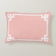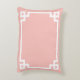 Decorative light coral pink and white Greek Key style geometric rectangular border accent pillow.