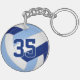 This team colours volleyball themed keychain for girls or boys features the realistic image of a volleyball that has light and dark blue and white panels, upon which you can customize the player's name and court position, plus school or club name and mascot name on the front and jersey number on the back - by katz_d_zynes
