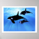 Two female and one male killer whales hunt together in the beautiful clear ocean.