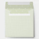A light mossy green and white gingham pattern outer envelope with a matching light green and white polka dit heart back liner makes a sweet gender neutral baby shower invite for the new mommy to be who is expecting a baby boy or girl. Matches perfectly with the adorable baby lamb baby shower invitations. Designed © Chrissy H. Studios, LLC. All Rights Reserved.