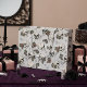 Hand-drawn in black ink, this gift bag features a beautiful pattern of skulls, roses and spiderwebs in cream and blush tones, all against an elegant light grey background.