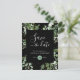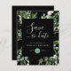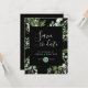 Elegant light sage, black and foliage 'Save The Date' with eucalyptus and a scatters of gold dots. A contemporary style embellished with romantic calligraphy.