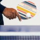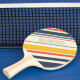 This is a customizable ping pong paddle design made of beige, blue, red, and yellow stripes.