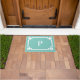 Decorative white Greek Key style geometric rectangular border on a light teal 18" x 24" door mat with a modern serif monogram.