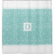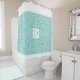 White and light teal blue damask pattern with white scalloped borders and monogram shower curtain. On the upper and the bottom parts of the curtain there are white bands with scalloped edges while in the centre there is your monogram in light teal in a white frame. You can personalize it with your name.