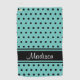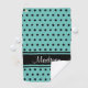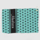 This design has a light teal background with black polka dots and black and light teal stripes. The name is in a script font and can be customized using the template field.