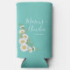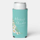 Pretty wedding seltzer can cooler features watercolor white daisies corner on light teal background with white customizable text blocks in modern fonts